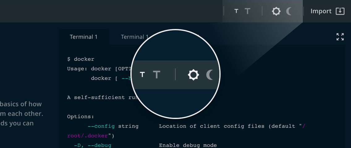 On the upper right corner, you will find the dark mode switch and the option to change the font size. Also, you will see the icon to import files from your local computer.